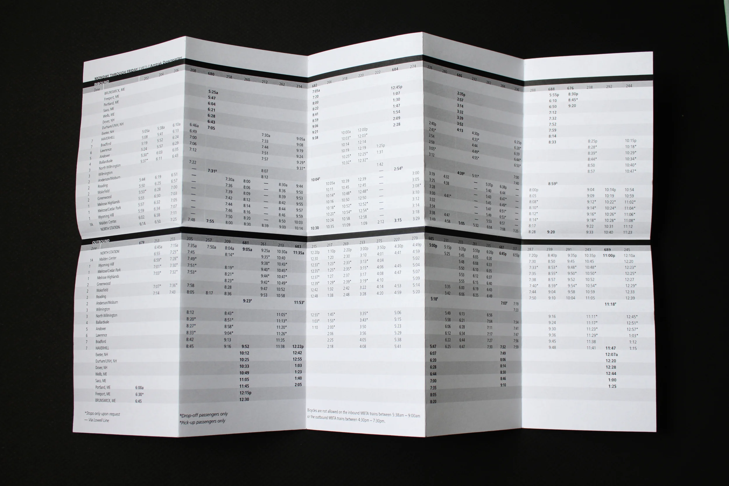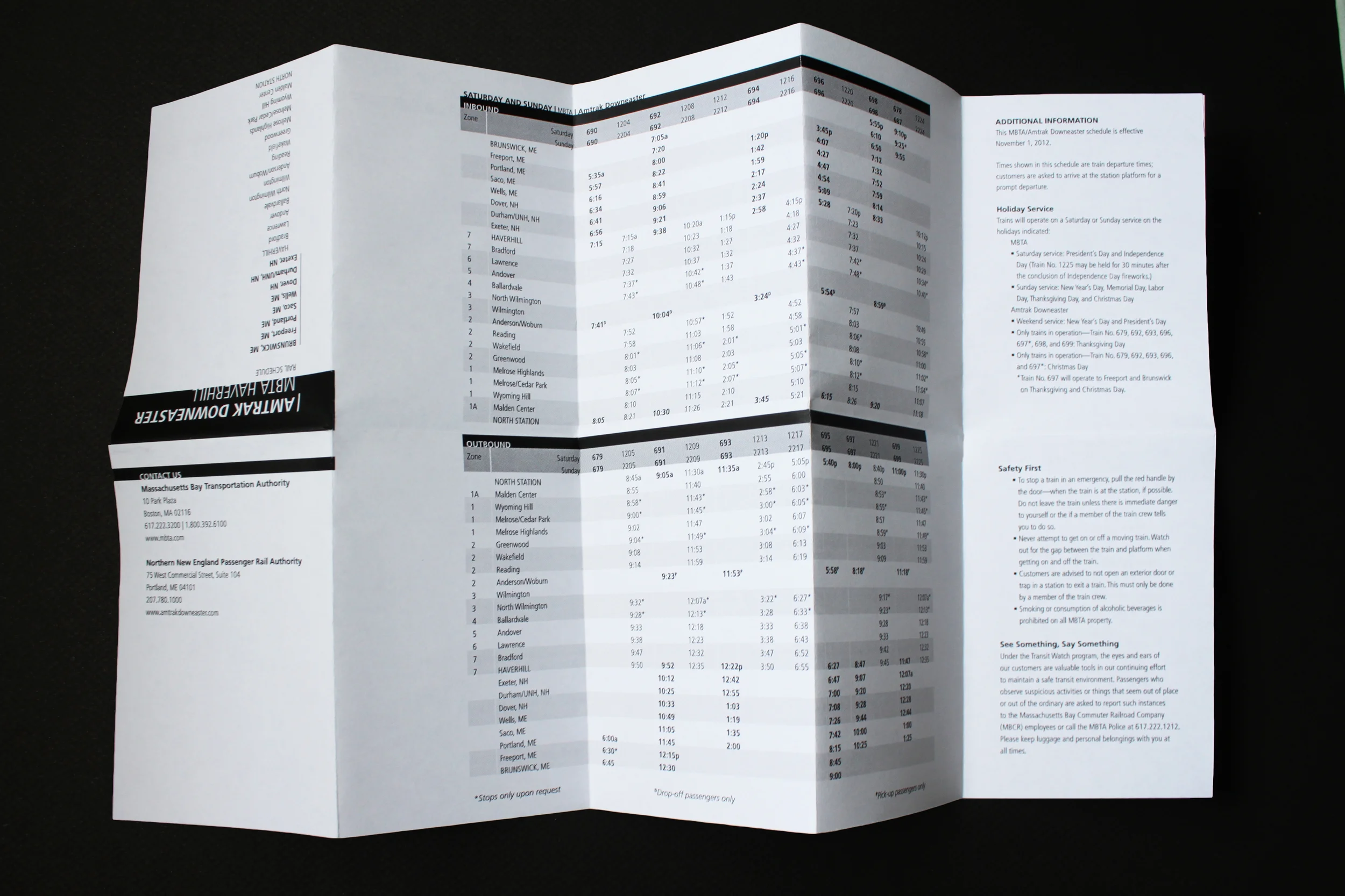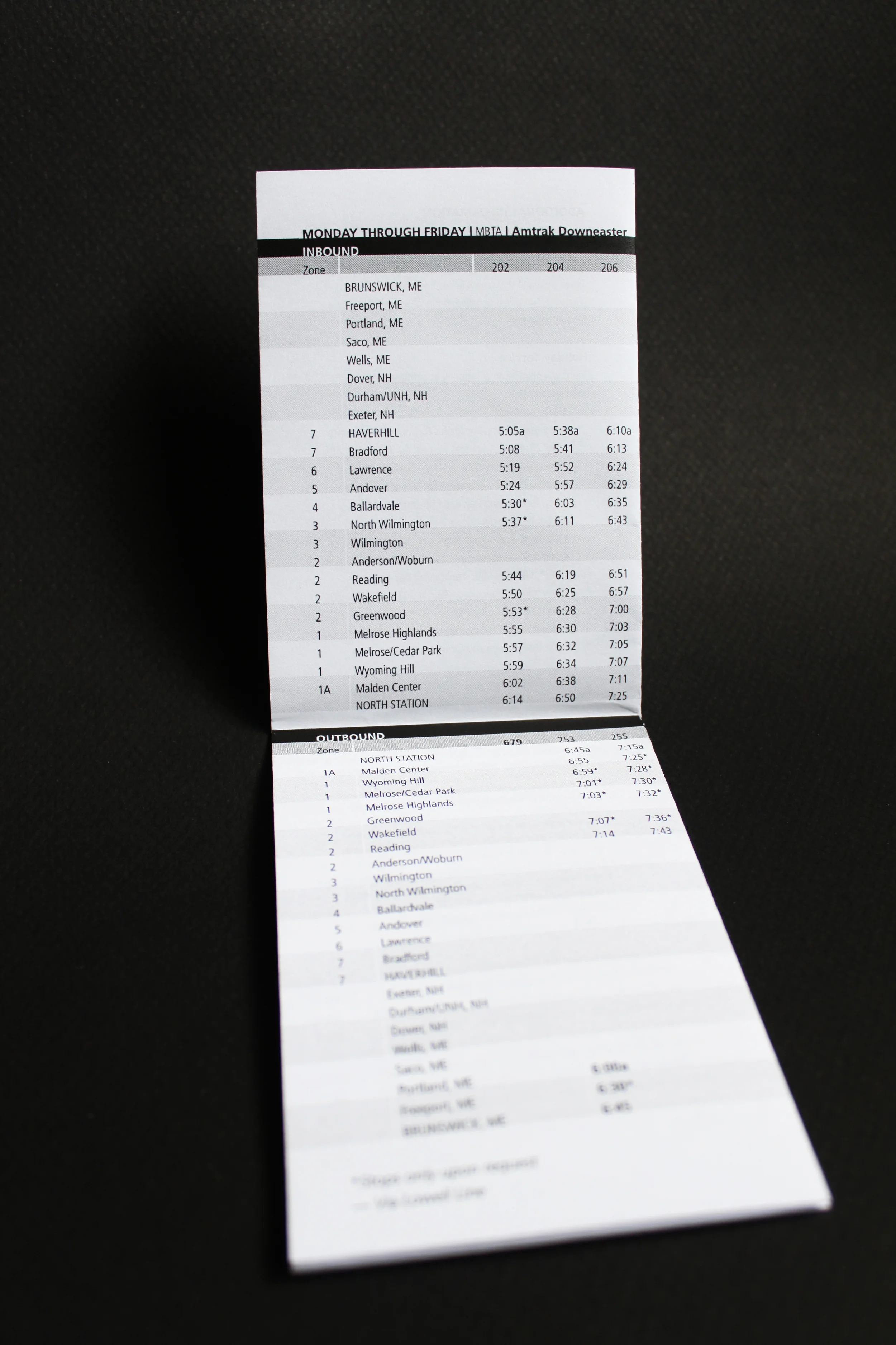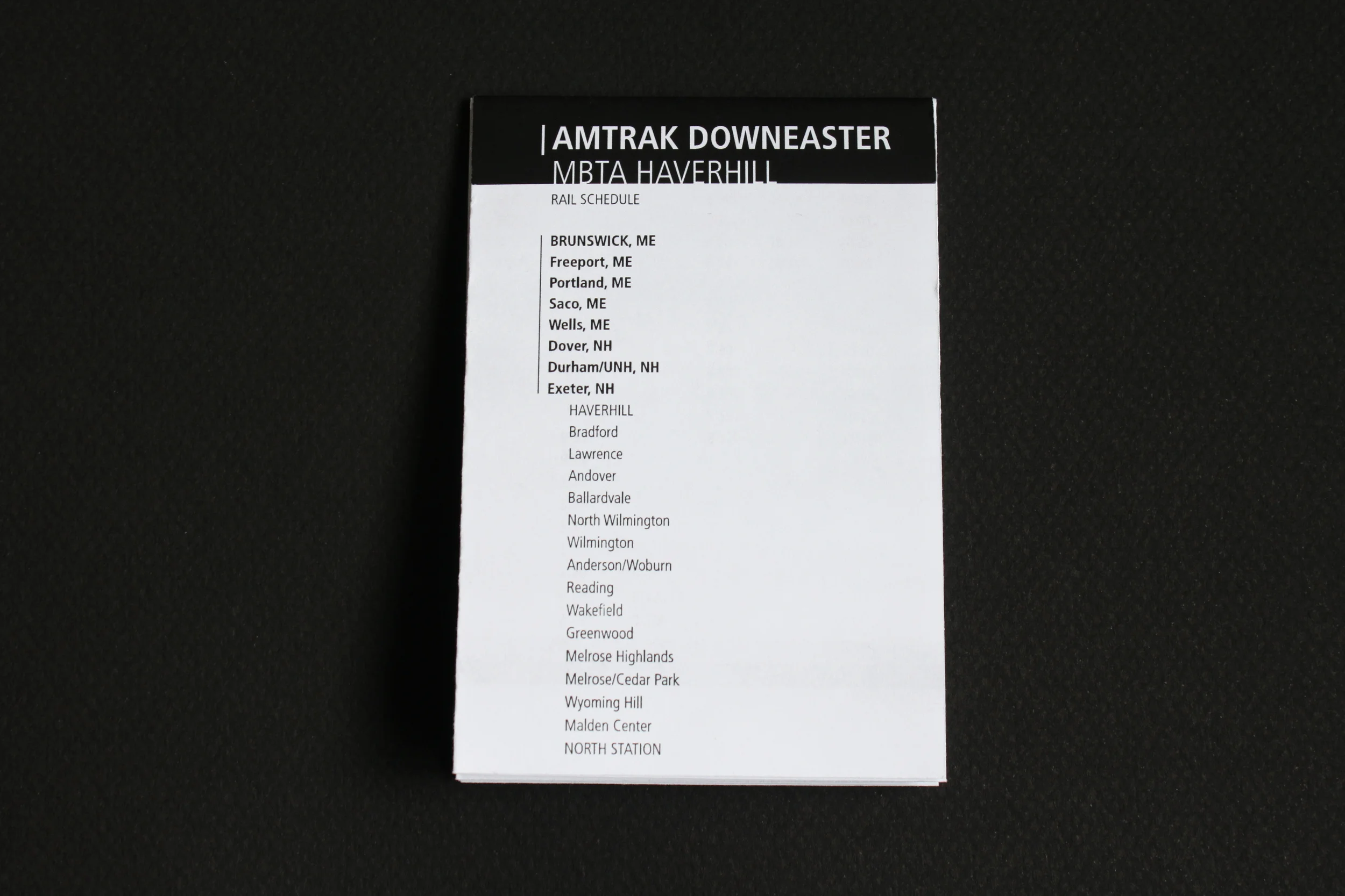 Since the MBTA Haverhill and Amtrak Downeaster trains share multiple stations, a consolidated schedule provides more insightful information. Text is arranged to display multiple sets of information on a pocket-sized pamphlet. To keep production costs low, the schedule is set in black and white.