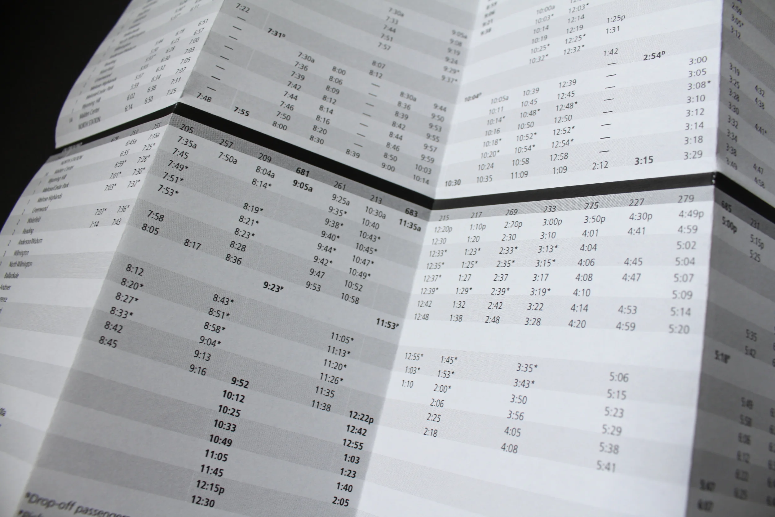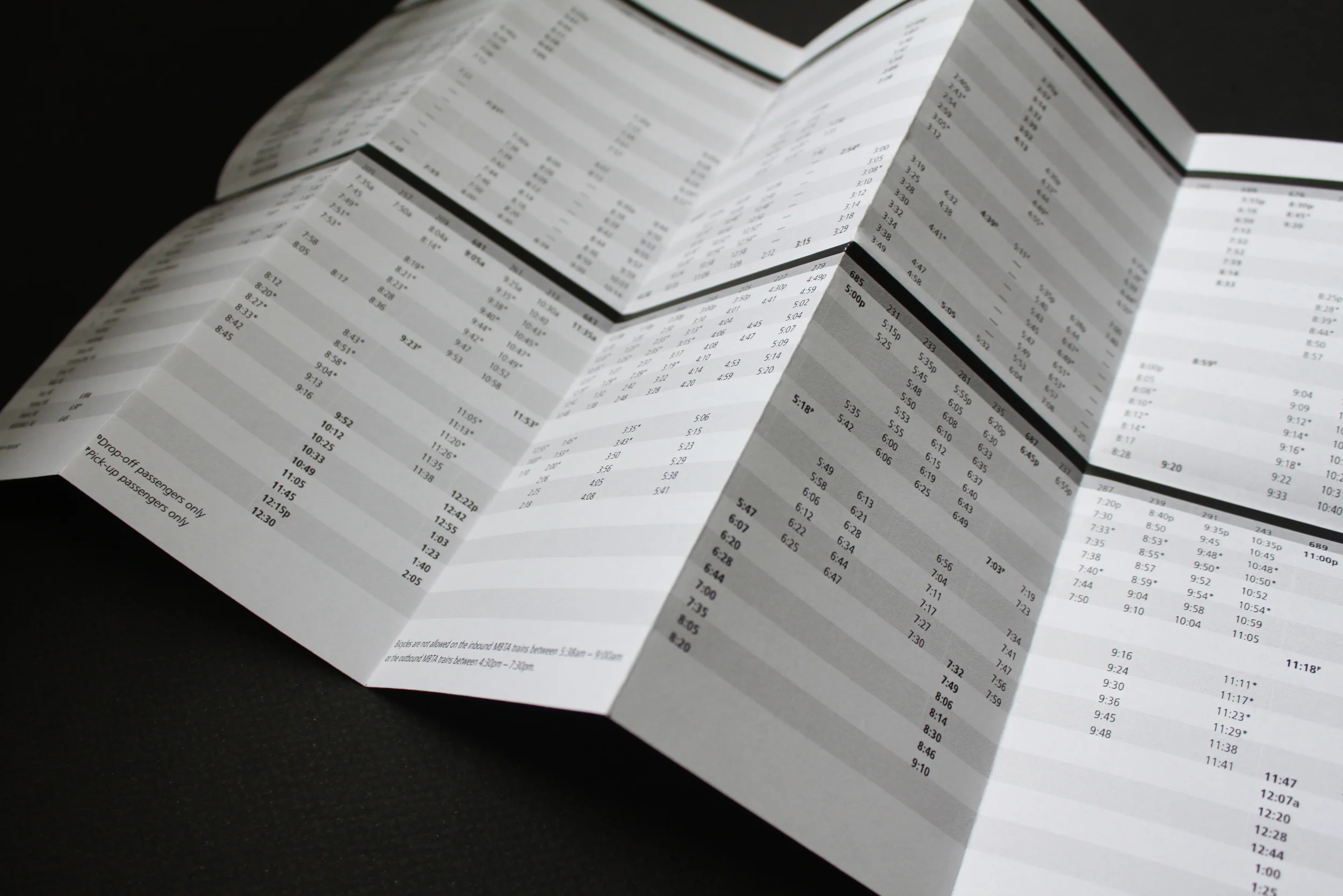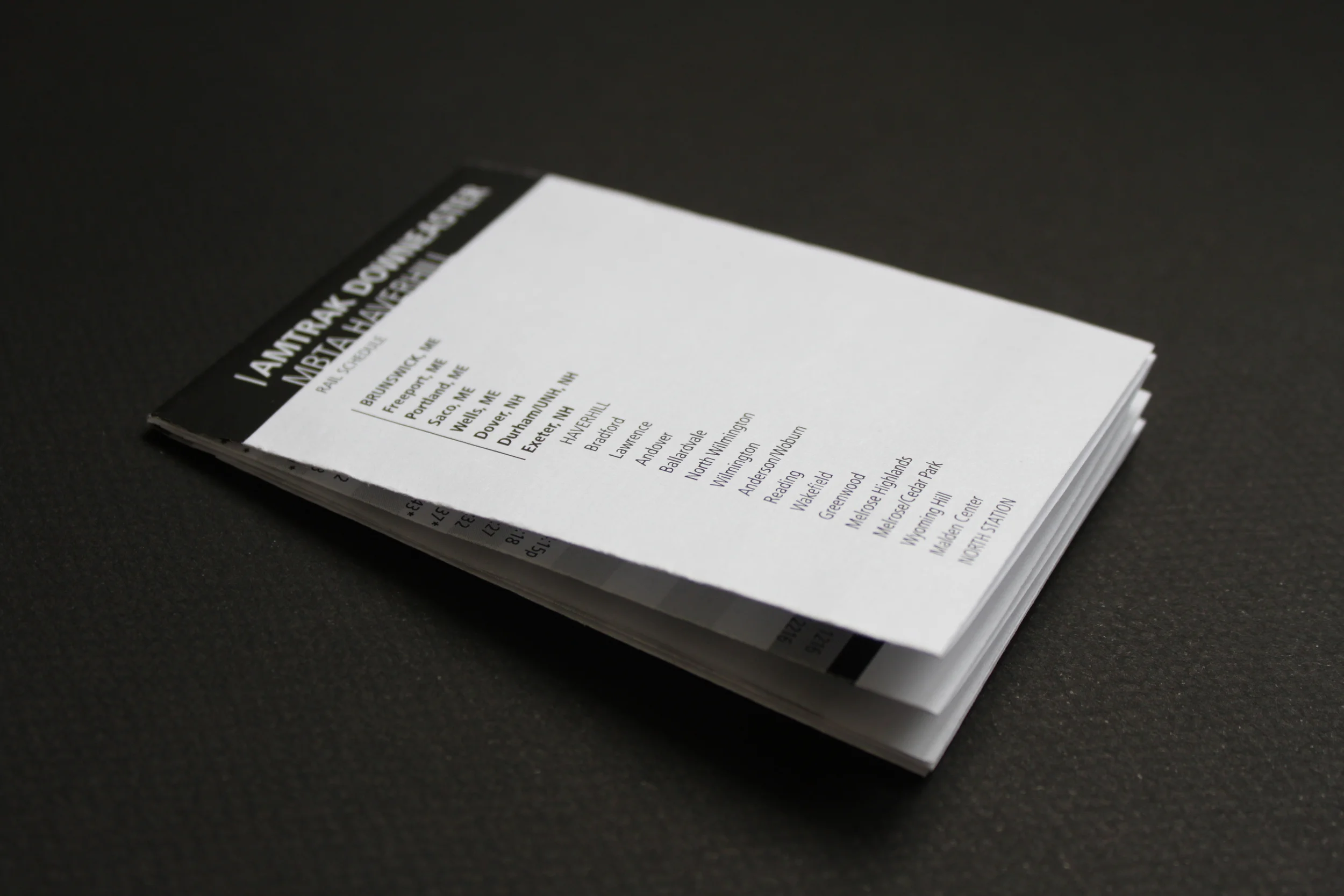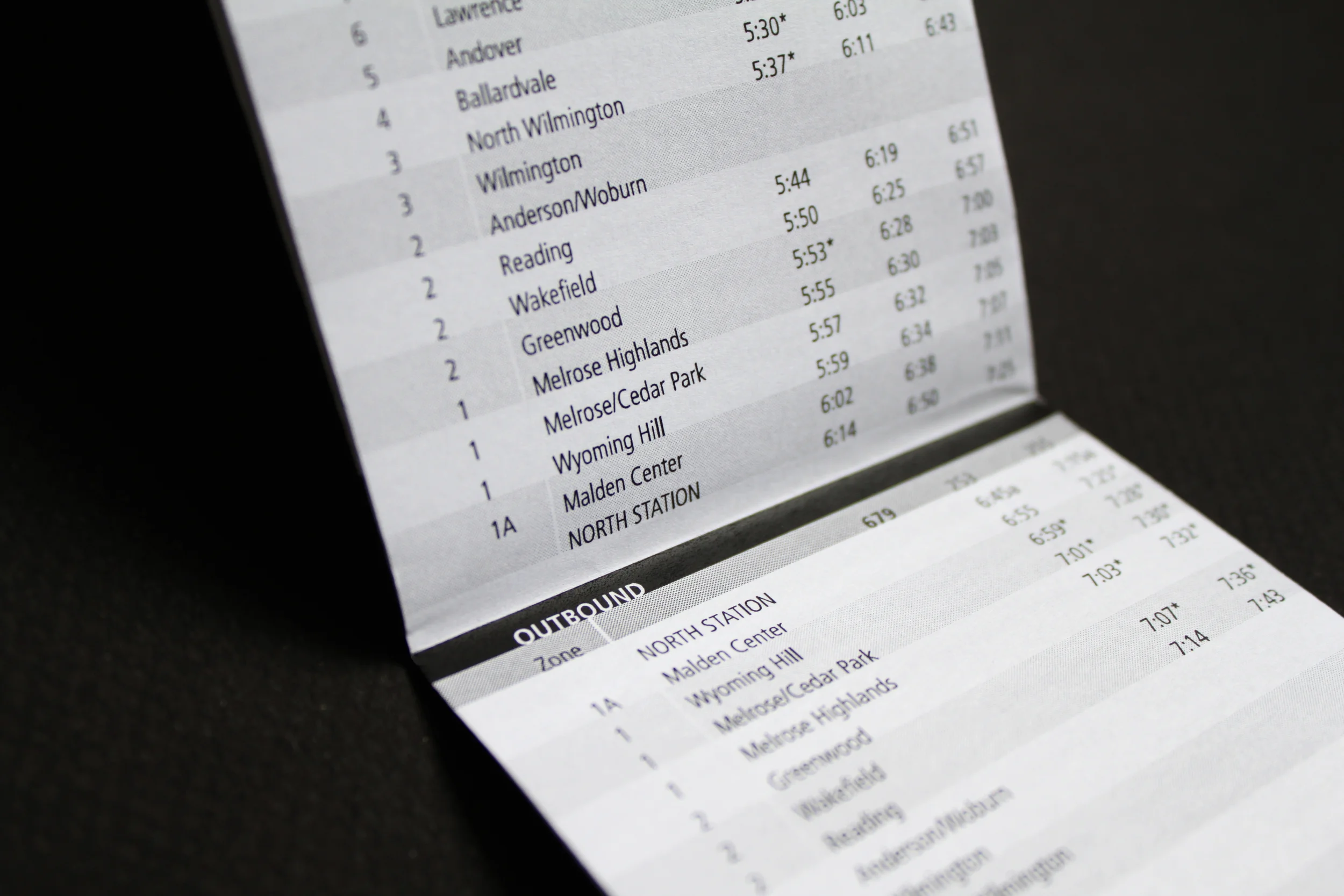 Since the MBTA Haverhill and Amtrak Downeaster trains share multiple stations, a consolidated schedule provides more insightful information. Text is arranged to display multiple sets of information on a pocket-sized pamphlet. To keep production costs low, the schedule is set in black and white.